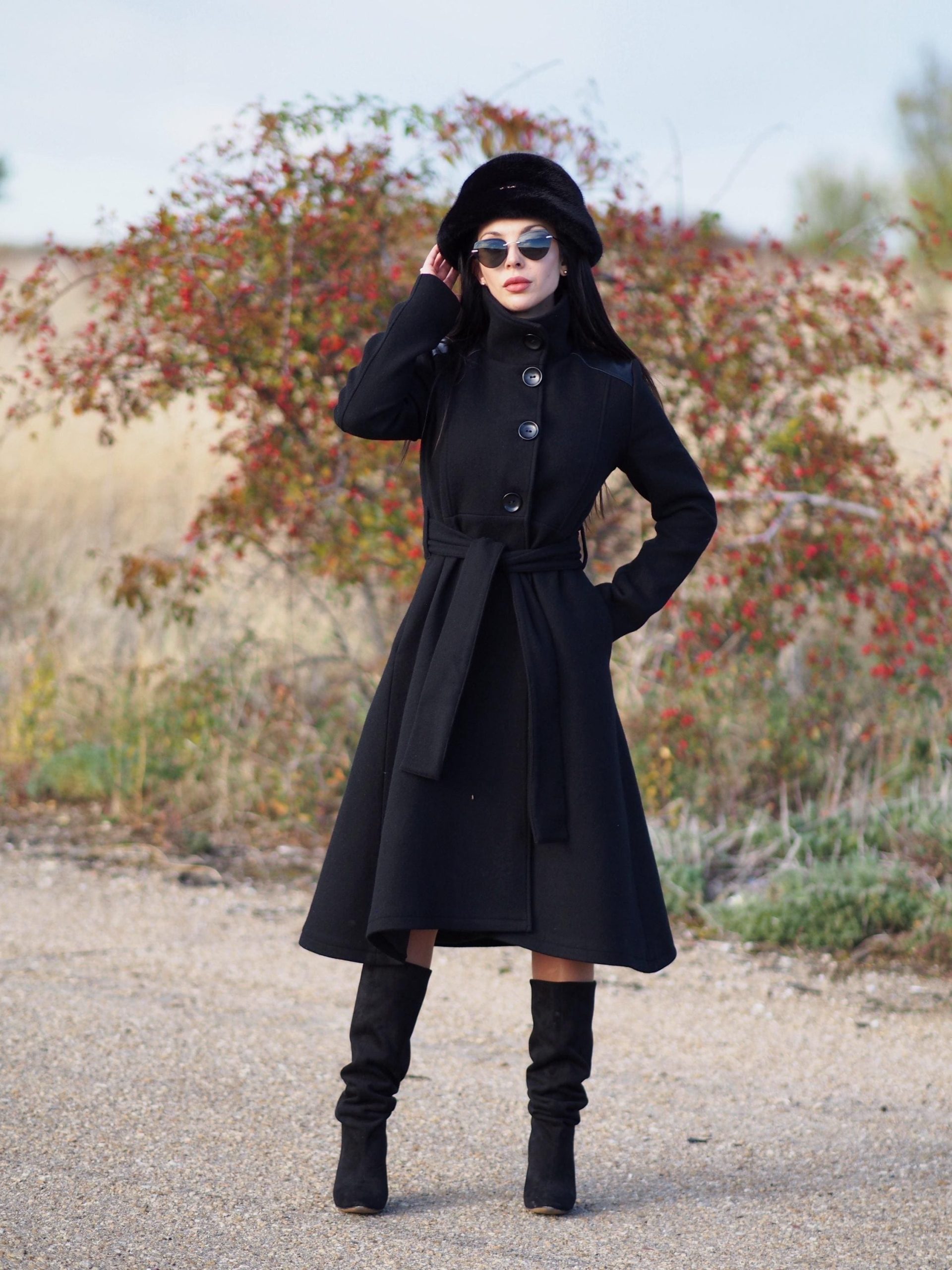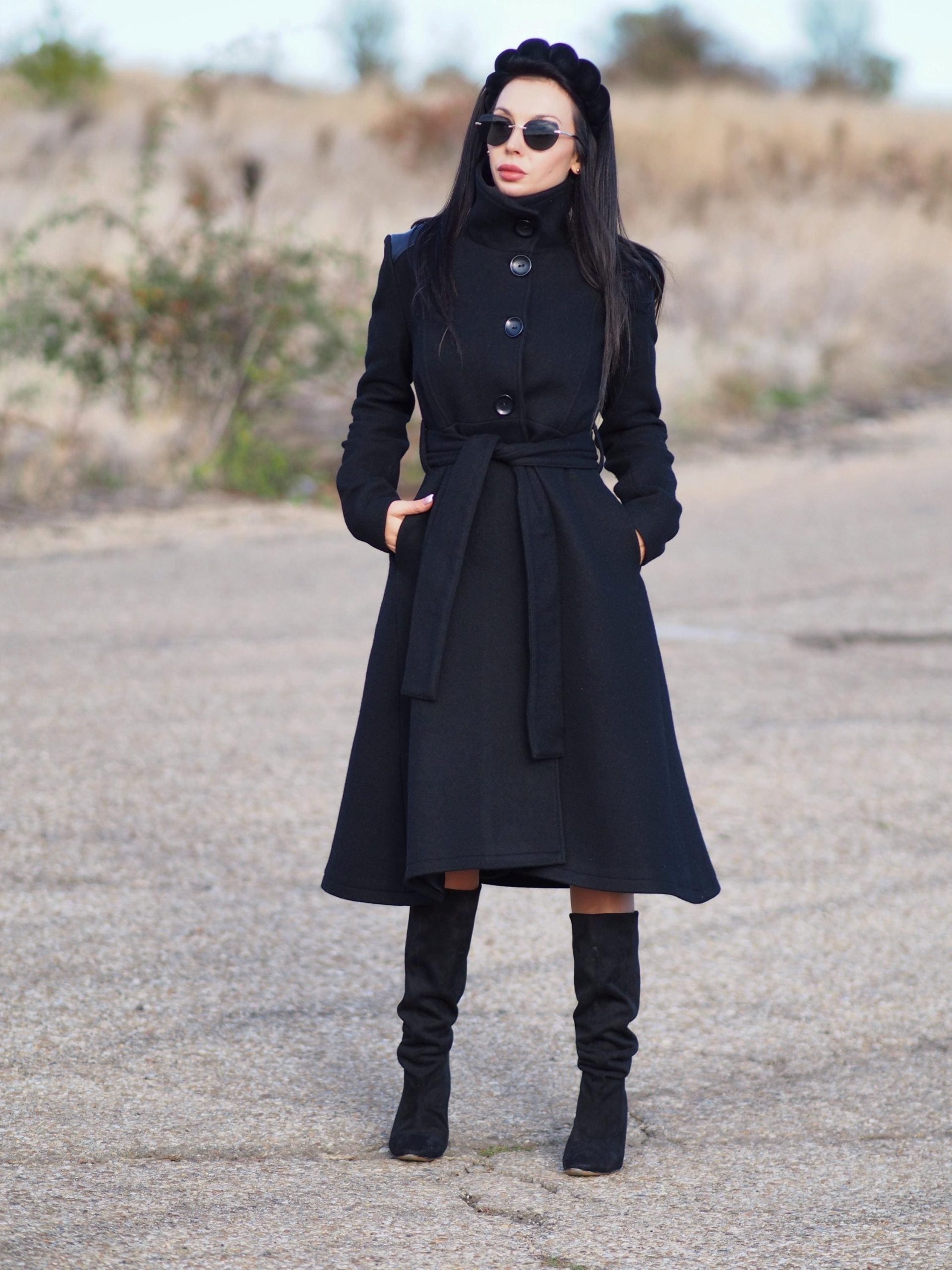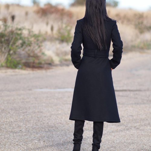 Elegant long black wool coat with genuine leather shoulder panels